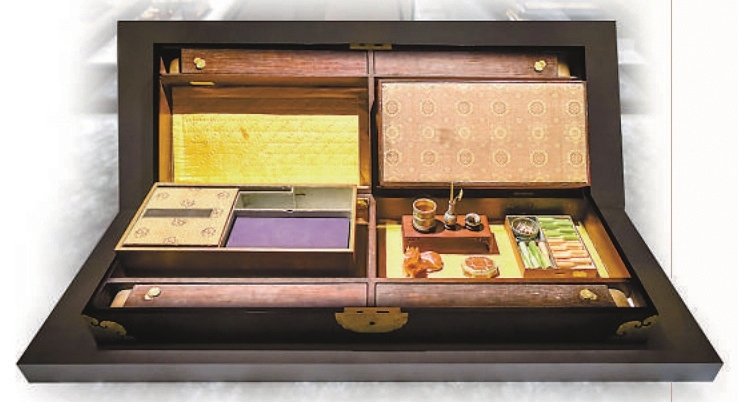 方寸之地,布置简洁。上方悬挂乾隆楷书“五经萃室”匾,下方陈设的《五经萃室记》炕屏紫檀作框。还有一张楠木十六屉炕桌,曾经存放五经,供乾隆随手取阅。