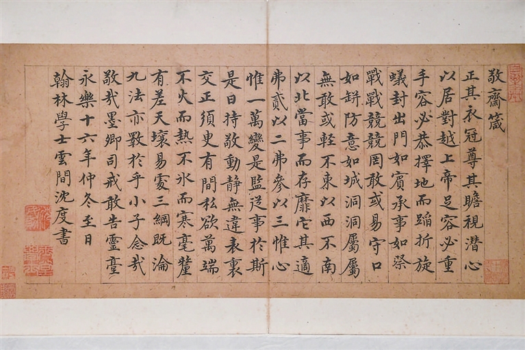 此次展出的是沈度楷书《敬斋箴册页》。内容是训诫君子日常居处应对应有的端重之态和庄静诚实的内外修养。