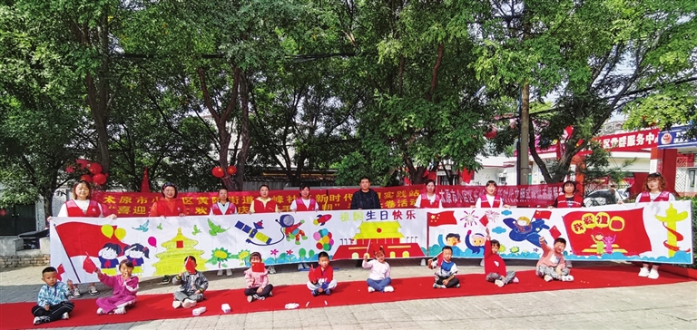 上午9时,十几名幼儿园孩子在老师带领下来到社区晨练小广场,在社区工作人员引导下,“小天使”们与志愿者共同绘画十米长卷。
