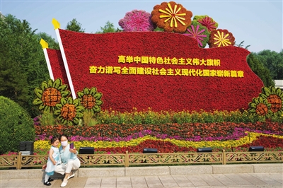 今年国庆摆花,天安门广场的中心花坛以18米高巨型花果篮为主景,长安街沿线共布置了14处立体花坛,较去年增加了双子座大厦、长安大厦、军事博物馆前广场、京西宾馆西门4个点位。到25日晚,广场中心花坛和长安街14处主题花坛全部完工。