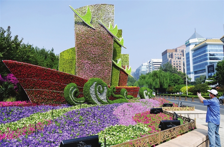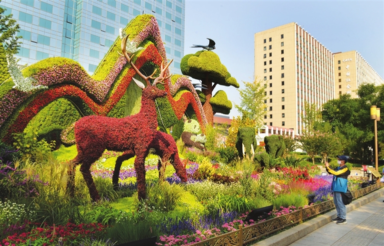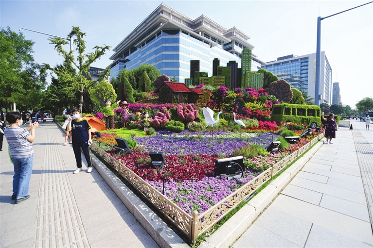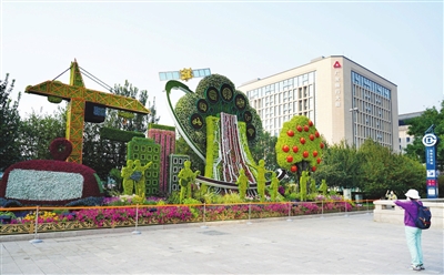 “花坛设计很接地气,要反映日常生活,让每个人都能从中找到自己。”国庆花坛总设计师、北京园林古建设计研究院高级工程师蓝海浪介绍,比如西单东南角的“绿色生活”花坛,就融入了露营、野餐等户外潮流生活方式。而西单西南角的“富裕生活”花坛,则用小木屋、金色麦浪和塞满了瓜果蔬菜的卡车等园艺小景,表现出一派丰收景象。