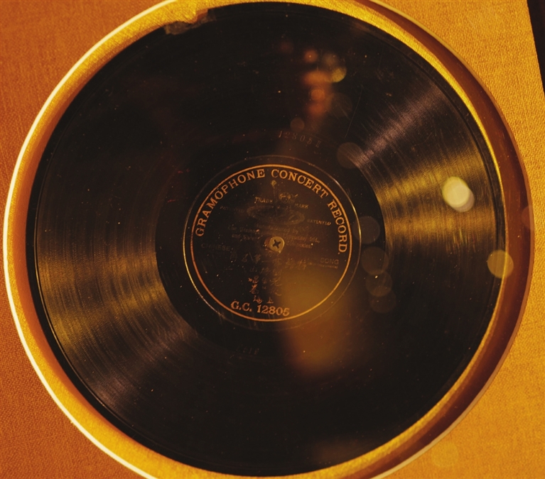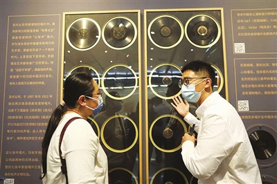 亮相展览的第一张唱片于1903年灌制,是目前已知的最早一期中国本土黑胶唱片。因其片心图案为带翅膀的小天使,被称为“小天使唱片”,其内容是京剧老生刘培山唱的《牧羊卷》。旁边,录制于1904年的中国本土龙纹唱片也是中国有声历史的重要实物,代表着最早期中国唱片的制式与样貌。其龙纹标志,也显现出这种文化产品当时还只能服务于王公贵族。