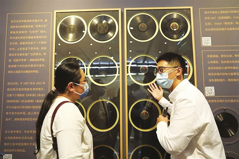 物克多唱片机、爱迪生蜡筒、粗纹唱片、密纹唱片、红唱片……步入展厅,可以浏览到自清末黑胶唱片传入中国100多年来,出现在中国大地上的各类黑胶唱片及相关文物。它们承载着不同时期音乐和曲艺的美妙,也记录了中国近现代文化艺术的脉搏。首都图书馆收藏的黑胶唱片共有1.5万种、约3万张,涉及戏曲、曲艺、民族乐等众多领域。此次展出的194张珍品,分为历史回响、时尚之风、光荣印记、辉煌历程四大板块。