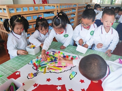 拼贴装饰中国地图、设计制作生日蛋糕……9月28日,省政府幼儿园幼中班开展了丰富多彩的迎国庆系列活动。活动现场,一双双眼睛专注而认真,一双双小手稚嫩而灵活,孩子们拼图、做蛋糕,不亦乐乎,五彩缤纷的作品表达了孩子们对祖国妈妈最美好的祝福。 张国英 张提 摄