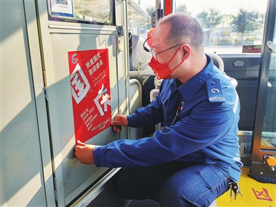 843路公交驾驶员刘浩峰说:“我平时喜欢各种海报。这次装扮车厢,除了悬挂国旗外,我还自己设计了几款国庆海报,打印出来张贴在车厢内。装扮一新的公交车首次上路,就得到了乘客的一致好评。”
