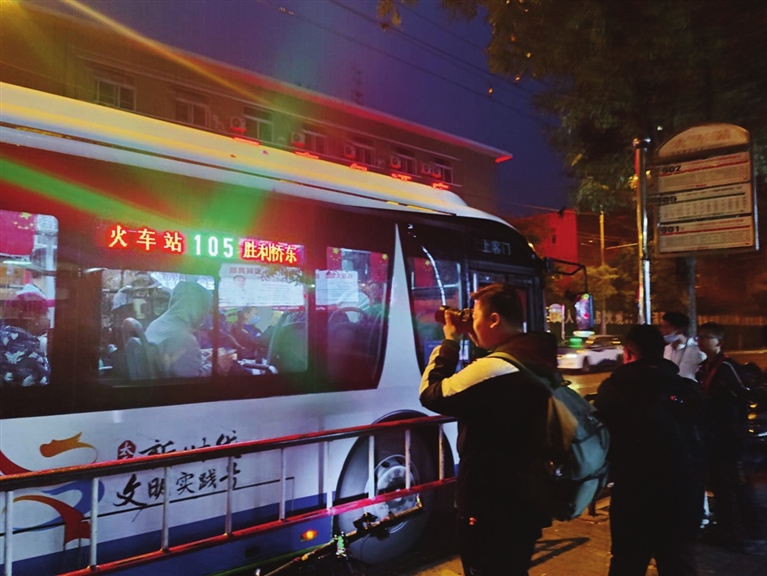 车里的一对老年夫妇引起了记者的注意。“我家住彭西四巷,听新闻上说今天105路恢复运营,我4点半就和老伴儿起了床,就是为了赶上‘首班车’。”赵大爷表示,他和老伴一大早开着车赶到了火车站,生怕误了这趟特别有纪念意义的“首班车”。