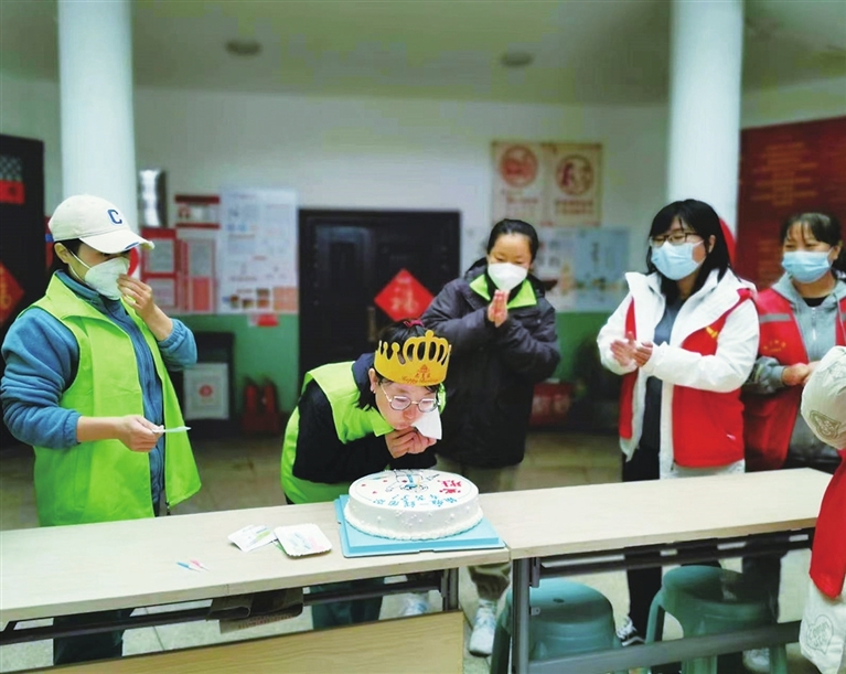 一次偶然的聊天,康乐苑社区党委书记李瑶得知了王志伟的生日,默默记在心里。在王志伟生日这天,李瑶买来蛋糕,在午间休息时端到了王志伟面前。蛋糕上有“大白”的图样,还有“抗疫一线的你,辛苦了”几个字。看到社区工作人员的心意,王志伟感动不已,激动地说:“这是我最难忘也是最有意义的生日!”