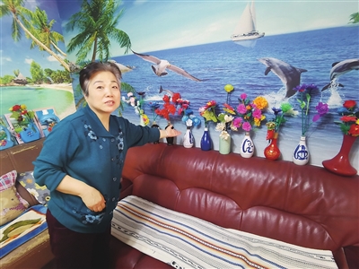 客厅的墙面,贴着大幅海滩图画,围绕在“海滩”周围的是一朵朵怒放的“鲜花”。海是假的,花是假的,但二者完美地契合在一起,一派生机盎然的景象,美不胜收。再看贺大爷的卧室,同样被装点得花团锦簇,床头摆着花,地面放着花,花花绿绿,枝枝叶叶,让人目不暇接。尽管已是深秋时节,但有这些“鲜花”装点,夏季似乎并未走远。