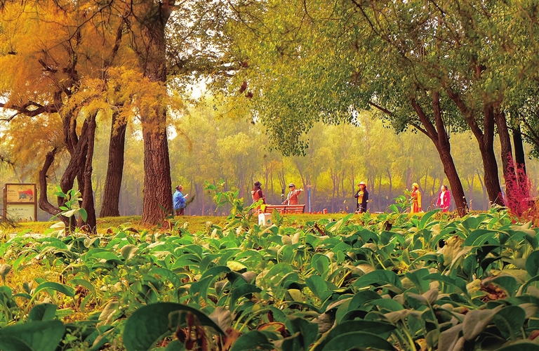 10月15日,我市森林公园内的游人徜徉在如画的秋色中。面对美景游人欣然起舞,表达心中的喜悦。