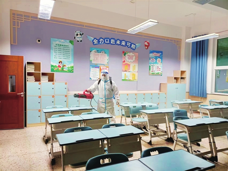 本着对广大师生生命安全负责的态度,该校全面落实各项防控措施,详细排查校园安全隐患,落实防疫物资准备情况以及培训各种消杀产品的使用方法,并邀请蓝天救援队专业人员对校区内教学楼、办公室、教室、卫生间、车库等区域,进行全面消杀,最后,由教师与保洁人员再进行清理擦拭,做到卫生清理不留死角,不留盲区,以安全卫生的环境迎接学生们返校。