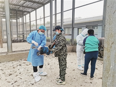 在做好消毒工作的同时,动物园还对园区内部分禽类进行了年度体检和新城疫、禽流感疫苗接种。根据不同鸟类的生理特性,兽医和饲养人员采取不同措施,尽量减少动物的应激反应,同时保证了操作过程中人员和动物的安全,先后给百鸟苑、雉鸡苑、孵化室共计330余只鸟儿完成了疫苗注射。此类疫苗将在注射一至两周产生免疫抗体,免疫期一年。