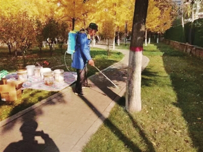 为做好树木秋季养护管理,连日来,市园林局绿化建设服务中心、公园服务中心在所负责的工程、道路、公园等处展开树木涂白。据了解,树木涂白不仅具有杀菌作用,可以减少病虫害的发生,还可以增强树木防冻能力。图为龙潭公园工作人员正在作业。 刘晓亮 摄