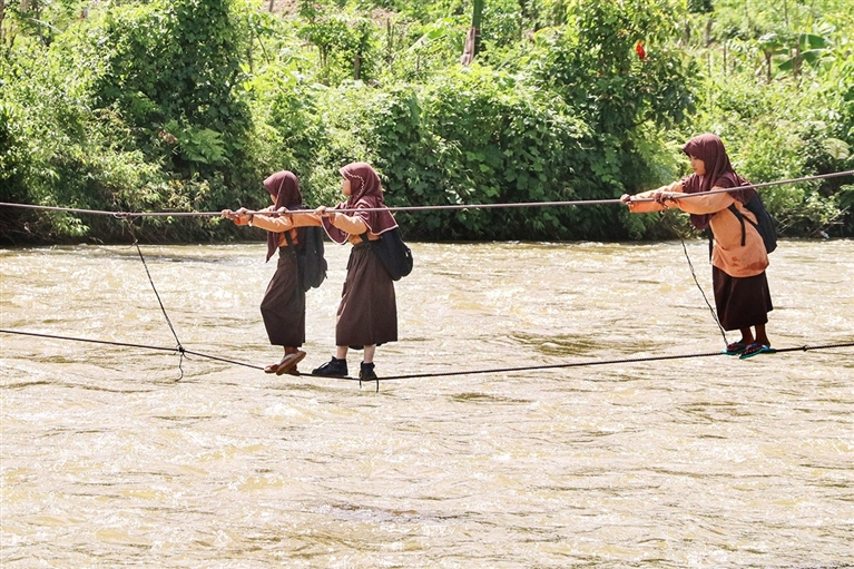 在印度尼西亚西亚齐地区,部分村落的孩子们需要通过钢索横跨河流上学。新华社 发