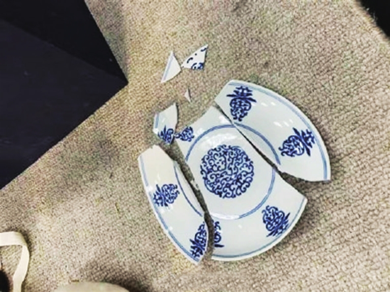 从台湾媒体曝光的图片可以看到,“清 乾隆 青花花卉盘”碎成了好几片,还有些细屑。台北故宫博物院28日表示,破损瓷器目前第一件“明 弘治款 娇黄绿彩双龙小碗”正在修复中,第二件“清 康熙款 暗龙白里小黄瓷碗”待修复人员处理,第三件“清 乾隆 青花花卉盘”待惩处程序完成,责任厘清后才会进入修复程序。