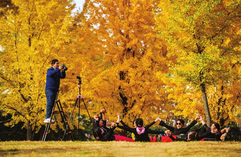 金灿灿的银杏成为今秋最后一抹亮色。10月30日,省城胜利桥西一游园内,市民沐着暖阳享受假日时光。 邓寅明 摄