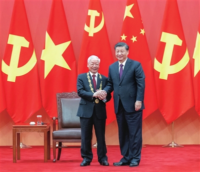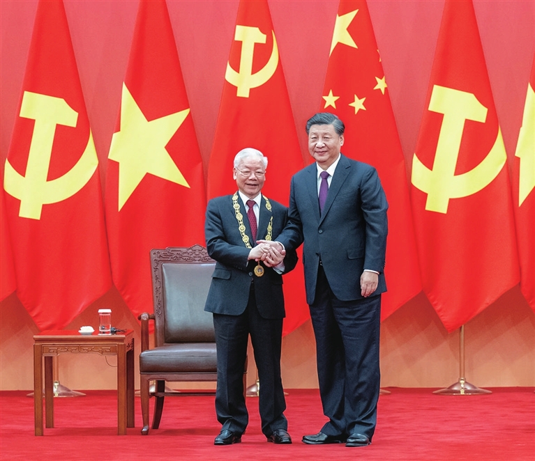 习近平发表讲话。习近平指出,阮富仲总书记是坚定的马克思主义者,是中国共产党的亲密同志和真诚朋友。在阮富仲总书记高度重视和亲自推动下,中越两党两国传统友谊得到巩固,政治互信不断增强,务实合作持续深化,交流互鉴日益密切。“友谊勋章”代表了中国共产党和中国人民对阮富仲总书记和越南人民的友好感情,象征着中越“同志加兄弟”的深厚情谊,蕴含着两党和两国人民共同追求美好未来的殷切希望。