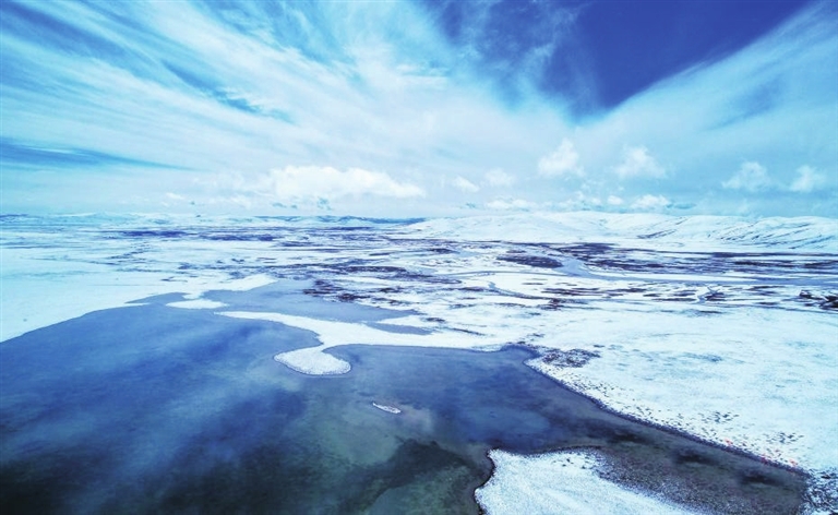 10月30日,受降雪影响,黄河源头玛多地区出现积雪,银装素裹,犹如人间仙境。由于降雪覆盖牧草,青藏高原独有的藏野驴种群通过远距离迁徙的方式寻找向阳的山坡觅食。洁白雪山、成群奔跑的藏野驴群、觅食的高原黑牦牛像散落在银盘里的“黑珍珠”,成为一道风景。图为被白雪覆盖的湖泊。 中新社 发