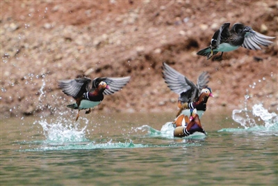 深秋时节,贵州省铜仁市江口县地落湖迎来了一群群越冬的鸳鸯,它们在碧绿的湖面上尽情地戏水游玩,时而翩翩起舞,时而追逐打闹,与地落湖构成了一幅幅优美的生态画卷。图为越冬的鸳鸯在碧绿的湖面上尽情的戏水游玩。 中新社 发