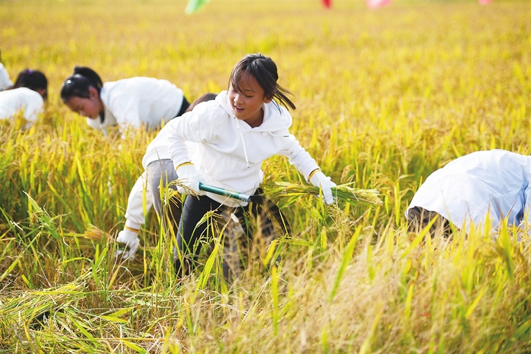 11月1日,在桃源县郑家驿镇澄溪桥村稻田,学生体验收割水稻。