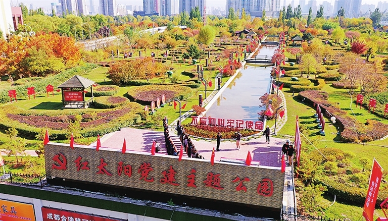 红太阳“红色精神”党建主题公园占地面积4万平方米,原为红太阳家具广场屋顶花园。今年,下元街道大王社区对这里实施提升改造,在最大限度保留现状布局、植物群落的基础上,让红色元素融入景观,并设置了党史标识、党建雕塑。