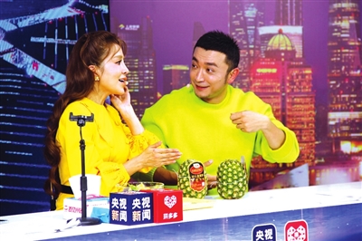 ▲央视主持人朱迅(左)与小尼(右)正在讲解产自菲律宾的金菠萝。张伟/摄