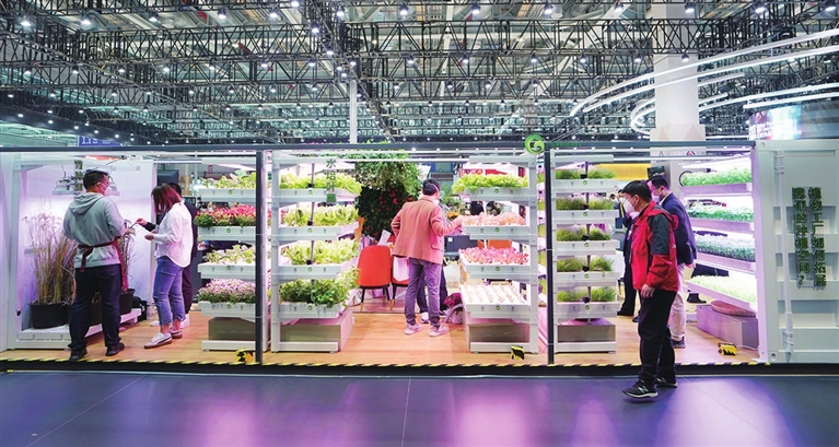 在第五届进博会的食品及农产品展区,光明母港(上海)种业科技有限公司将集装箱植物工厂的模型搬进展会,在超市货架般的装置上一层层排列种植蔬菜,现场展示智慧农业的新发展模式。新华社 发