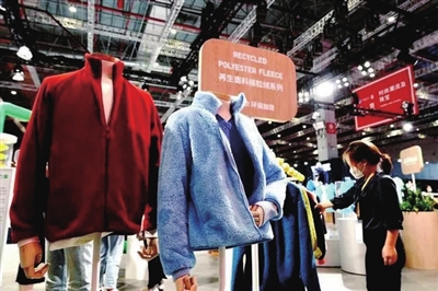 展台上还原出的“生产线”,展示了回收塑料瓶经过分拣、破碎、融化、纤维再造、面料生成直至制成成衣的全过程。“这个面料的衣服近几年特别流行,今天才知道塑料瓶也能变成新衣,很神奇也很环保,感觉个人的消费选择也能给绿色发展做贡献。”观展者黄昊说。