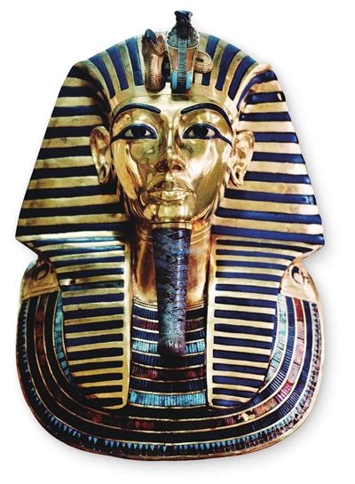 陵墓中出土了5600件珍贵文物,这个11斤的黄金面具,发现时就套在他木乃伊的头上。面具是金箔做的,嵌有宝石和彩色玻璃。前额部分饰有鹰神和眼镜蛇神,象征上、下埃及(上埃及以神鹰为保护神,下埃及以蛇神为保护神);下面垂着胡须,象征冥神奥西里斯。