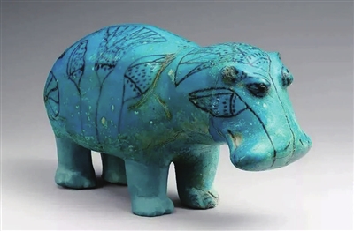 在第二中间时期的墓葬中,常可以发掘出湖蓝色珐琅质地的河马雕像,河马身上绘制有莲花、水鸟的图案,表明河马的生活环境。