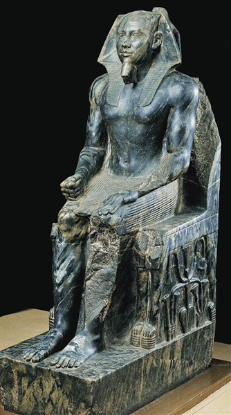 这尊闪绿岩雕塑发现于哈夫拉山谷的神庙中,面部、胸腹、四肢和指头的比例非常严谨,神态威严,肌肉线条流畅,头上的王巾条纹和腰间短裙的褶皱都细腻整齐。