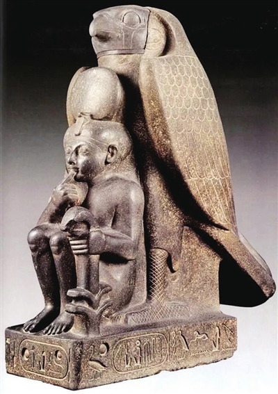 这尊雕像的主体是用花岗岩雕成,鹰神的脸部用的是石灰岩。年幼的法老在鹰神的庇佑下,右手食指托腮,左手握着芦苇,头顶着太阳圆盘。这几件事物共同构成了他名字的象形文字。
