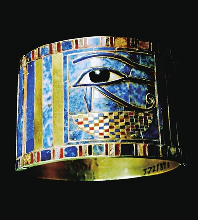 臂环上的眼睛是“荷鲁斯之眼”。相传鹰神荷鲁斯的左眼代表月亮,右眼代表太阳。荷鲁斯之眼作为陪葬饰物,有驱邪和保佑重生的寓意。他的银质棺材也是鹰神荷鲁斯的形象。