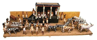 他的墓室遭受过多次洗劫,财宝洗劫一空,墓中的彩色壁画也被摧毁。所幸的是,墓中一处隐蔽的房间于1919年被发现,25件精致的木雕尘封四千年后重见天日。这些木雕高度还原了当时人们劳动的场景,包括面包制作、肉类加工、啤酒酿造等。