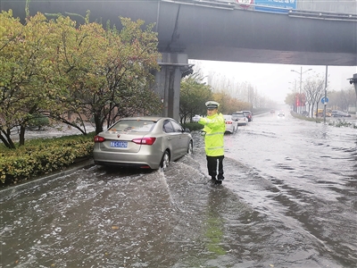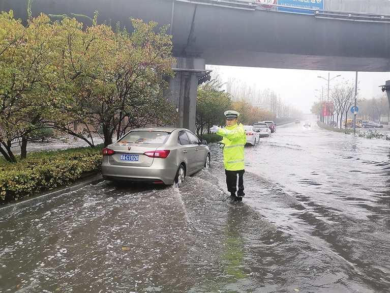 武鹏飞这一站就是一个多小时,衣服、鞋子全部被雨水浸透,仍然坚守在岗位上,直至道路通行恢复正常、积水渐渐退去后,他才放心离开。