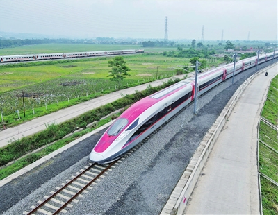 11月9日,印尼万隆德卡鲁尔车站。一辆带有宝石红涂色的高铁列车缓缓启动,标志着雅万高铁试验段接触网热滑试验全面展开。雅万高铁项目自2016年正式启动以来,在两国元首关心下顺利推进,已成为共建“一带一路”的标志性项目。项目建成后,雅加达到万隆的旅行时间将由现在的3个多小时缩短至40分钟。