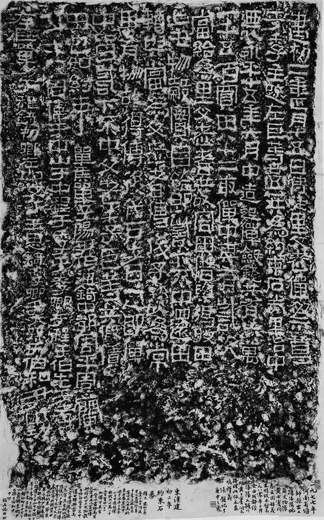 我仔细看了一下,这张拓片和六尺整张宣纸的高度相差不多,宽约有八九十厘米。字迹书体为隶书,方整偏扁一些。虽一些字迹漫漶不清,但书法古拙朴茂、浑厚遒劲。拓片最下方,张颔先生用工整、古雅的小楷题写了两段跋文,其中一段跋文写道: