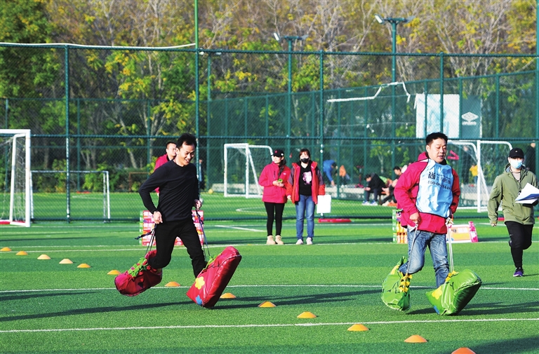 11月13日,在汾河景区里,人们大步流星,你追我赶,通过趣味运动寻找快乐,享受冬日的阳光。
