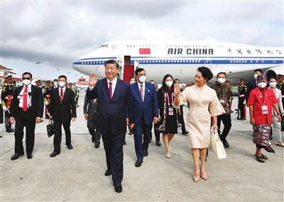 当地时间14日下午,习近平乘坐的专机抵达巴厘岛努拉莱伊国际机场。印尼对华合作牵头人、海洋与投资统筹部部长卢胡特,巴厘省省长科斯特等高级官员在机场热情迎接。礼兵分列红地毯两侧致敬,身着民族服装的当地青年演奏起印尼传统乐器伽美兰,盛装印尼女青年跳起巴厘岛传统舞蹈“朋德舞”,当地学生挥舞中国和印尼两国国旗,用中文欢呼“欢迎,欢迎!”