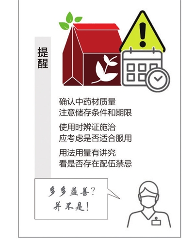 北京友谊医院药学部主任鄢丹介绍,对于中药材,首先要考虑本身的质量,比如中药材是从哪儿买来的,品质如何。此外,中药材储存还有环境要求和保质期。如果储存不当,可能会发霉或生虫。即使中药材质量没问题,也要辨证施治,考虑是否适合服用。“药品都是有适应症和适应人群的,具体用什么方式服用,用法用量是多少,这些都有讲究。”