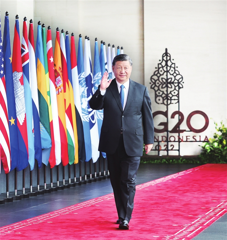 当地时间11月15日,二十国集团领导人第十七次峰会在印度尼西亚巴厘岛举行。国家主席习近平出席并发表题为《共迎时代挑战 共建美好未来》的重要讲话。这是习近平步入会场。 新华社 发