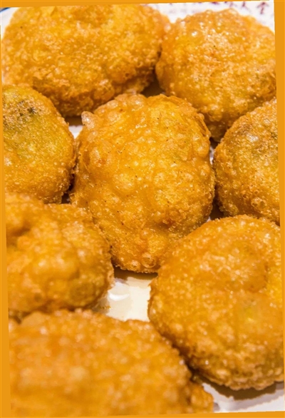 山西甜品中的排面担当,要数逢年过节与婚丧嫁娶都少不了的黄米面炸油糕。蒸好和匀的黄米面裹入甜豆沙馅,用胡麻油炸得焦黄起泡。黄米面醇香而带有颗粒感,胡麻油又苦又香,为黄米面炸糕带来远比糯米炸糕更有层次的味道。