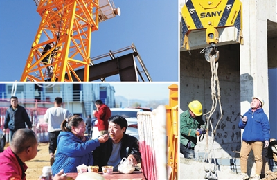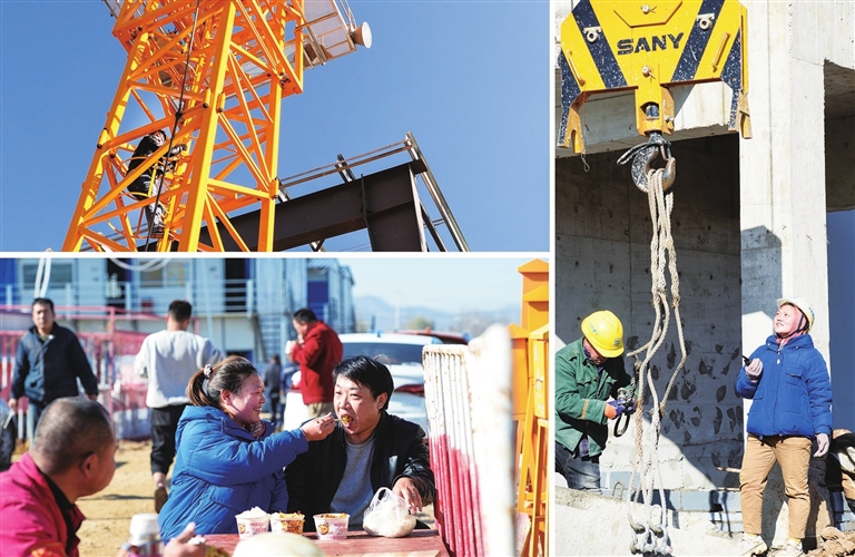 在太忻一体化经济区大盂产业新城建设工地上,有不少“夫妻档”,他们勠力同心,并肩奋战,舍小家为“大家”,贡献着自己的力量。左上图:11月17日,“空中”的丈夫韩俊杰。左下图:夫妻的工地午餐。右图:地面的妻子邓双芬。 牛利敏 王韵菲 摄
