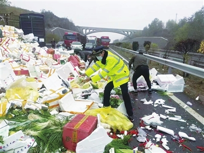 山西交控集团太旧公司路网运行保障大队五中队,日前快速处置了一起运送蔬菜货运车辆翻车事故,清运抛撒蔬菜20余吨。事故地点位于京昆高速平阳段石太方向,一辆满载蔬菜的货车与前方大货车发生碰撞后侧翻,导致道路中断。路网运行保障大队五中队以最快速度开展了事故现场处置、清障救援等工作,用时1小时25分钟,将中断道路抢通。 马向敏 摄