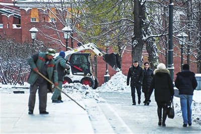 11月16日,市政工人在俄罗斯莫斯科的亚历山大花园清扫积雪。 新华社 发