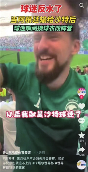 改了支持阵营的他高兴得手舞足蹈起来,庆祝着沙特队的胜利。
