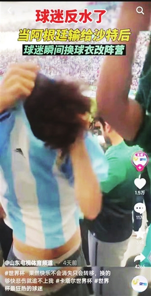 一位身穿阿根廷球衣的球迷突然脱掉了衣服,接过了一旁球迷递上的沙特队球衣。