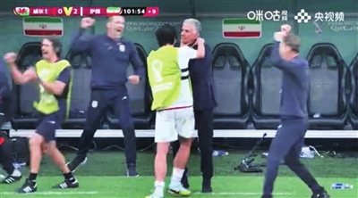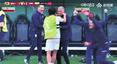 一位疯狂的伊朗队替补球员用这种方式庆祝着进球。被掐住约2秒钟后,年近古稀的老帅奎罗斯才反应过来,与队员共同庆祝。