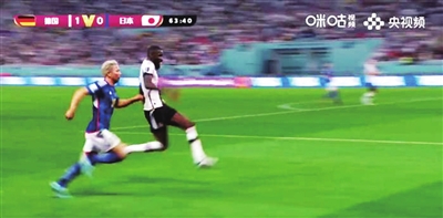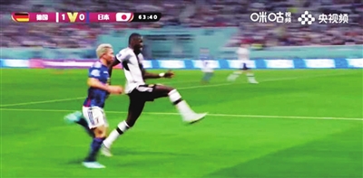 彼时,德国队后卫吕迪格在与日本队球员争夺球权,前者突然做出了“高抬腿”的跑步姿势奋力追赶皮球,酷似田径赛场的跨栏动作。