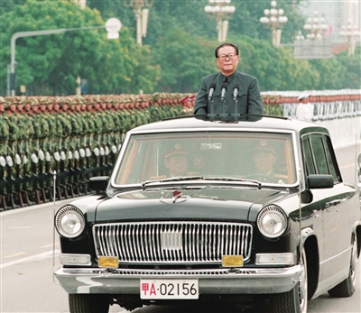 | 1999年10月1日,中华人民共和国成立50周年盛大庆典在北京天安门广场举行。江泽民同志检阅由人民解放军陆海空三军和人民武装警察部队、民兵预备役部队组成的地面方队。 |