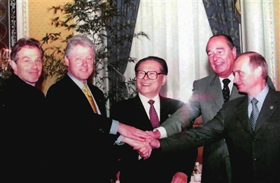 | 2000年9月7日,由中国倡议的联合国安理会五个常任理事国首脑会议在纽约举行。江泽民同志(中)同法国总统希拉克(右二)、俄罗斯总统普京(右一)、英国首相布莱尔(左一)、美国总统克林顿(左二)握手合影。 |